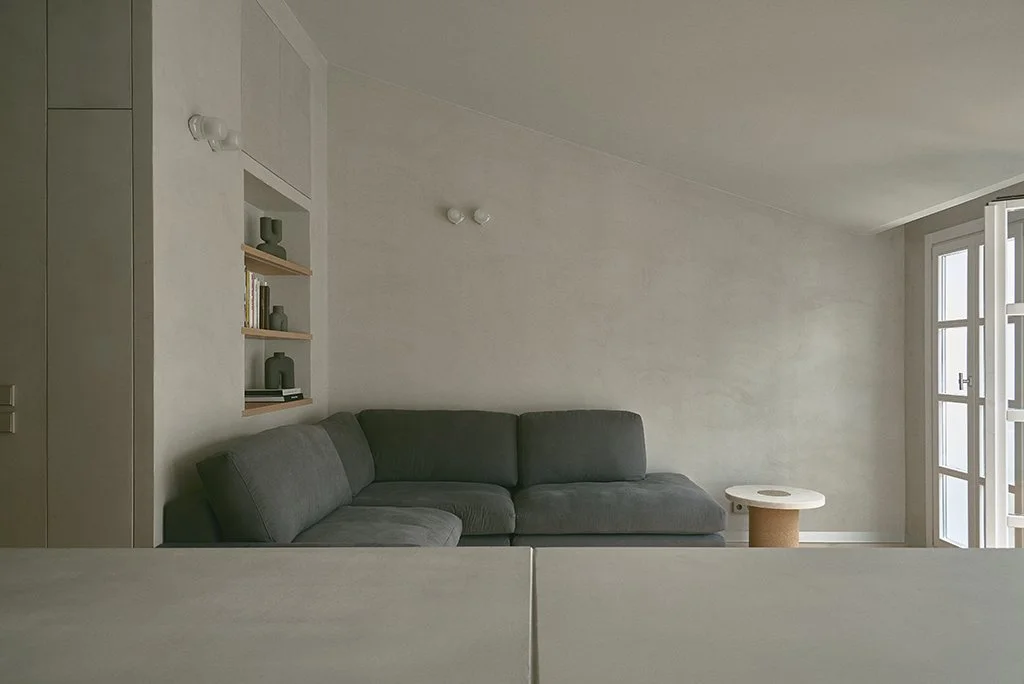 Cocinar, comer, socializar, descansar, leer o trabajar son algunas de las funciones que se desarrollan en la zona de día, a la que se accede a través de un pequeño recibidor que nos da la bienvenida a este ático de carácter sencillo, sincero y minimalista.
