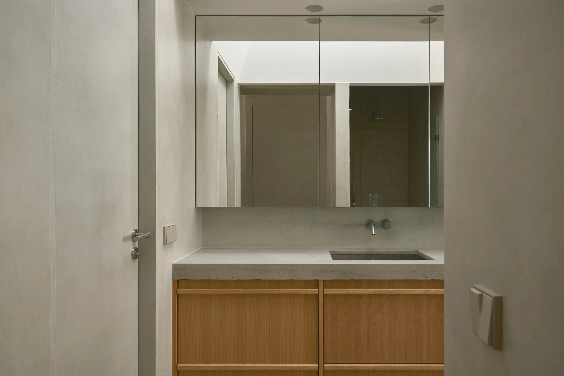Para conseguir uniformidad y continuidad, cocina y aseo se resuelven con los mismos materiales, buscando crear un lenguaje común entre los espacios húmedos. Hormigón gris para encimeras, paredes y techos, madera de castaño para mobiliario y suelos, acero inoxidable para grifería y tiradores, y alicatados grises para inodoro y ducha. Una selección de materiales que evoluciona y gana carácter con el paso del tiempo.